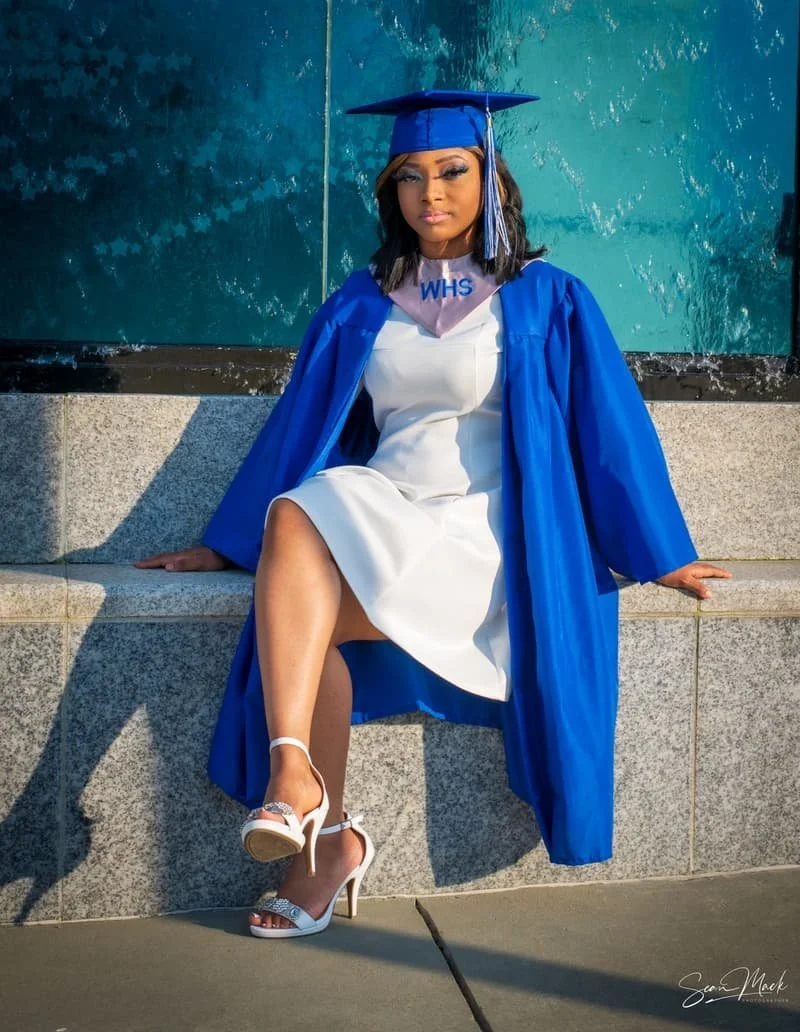A woman smiling outdoors at night, wearing a blue shirt, beige skirt, and colorful graduation stole with the words "Class of 2024 Black Girl Magic," standing in front of a hedge and a statue of a horse.